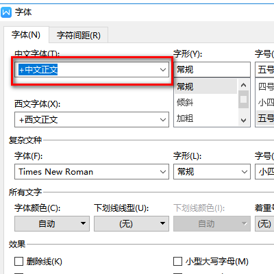 3.在字体页面中找到中文字体下的文字选择框,点击该选择框的下拉按钮进入到字体选择页面。