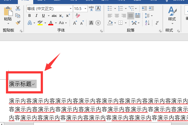 1、打开需要处理的word文档,将需要设为标题的文字用鼠标选中,这里以“演示标题”为例,选中后这些文字的背景色将会变成灰色: