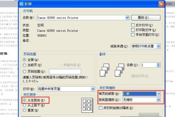 3、打印设置中有一个功能,就是【并打和缩放】,其中每页打印的版式,这里选择【2版】。纸型缩放选择【无缩放】。并打顺序选择【从左到右】。