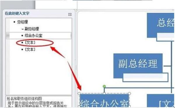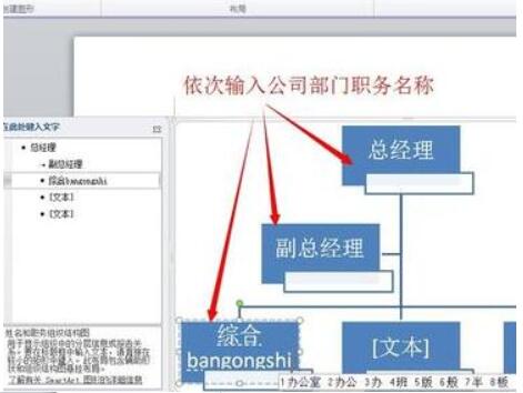 2、在文档左侧,点击【在此处键入文字】中的【文本】,或者点击右侧的结构图方框,依次输入公司部门职务名称。如果需要添加其他部门可以在小正方形上单击右键,选择【添加形状】-根据部门层级选择添加的位置。