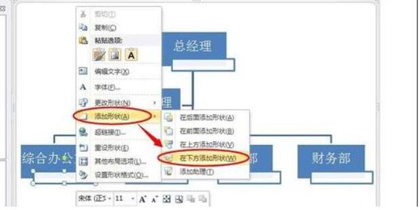 3.选定副总裁,如图2,右键,添加形状--在下方添加形状,添加三个形状