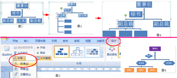 4.如图3,保持副总裁处于选定状态,点击设计,最左边布局下拉选择标准,再适当调整添加三个形状的大小和位置,就变为如图4所示的样子了