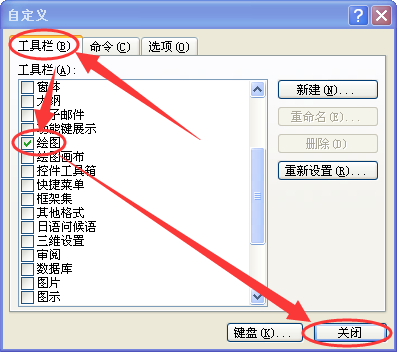 2、在随后弹出的【自定义】对话框中【工具栏】标签页下,把【绘图】前打钩,然后点击【关闭】。