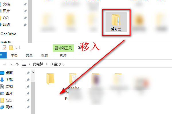 5、将两个窗口上下放置,把需要拷贝的软件整体移入到U盘中。