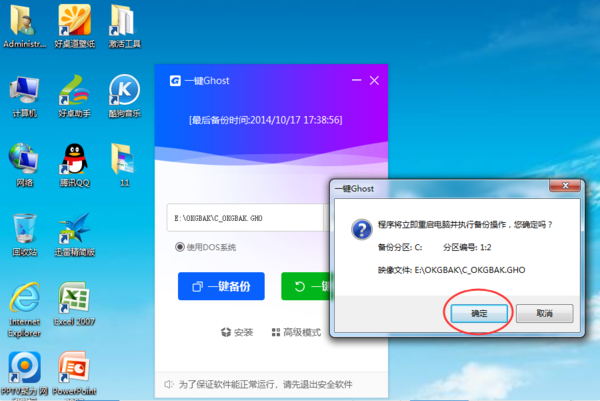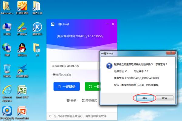 2、此时弹出提示窗口,点击确定,(默认情况下,将会自动备份我们的C盘,并将备份文件存储在另一个盘中,当然这个可以使用高级模式更改);