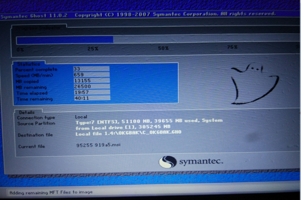 3、等待系统重启后,一键备份模式会自动执行ghost备份的过程(整个备份过程全程自动执行,如果使用高级模式的话,需要手工进行处理)。