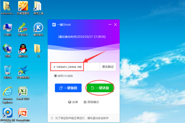 5、如需还原的话,可以再次打开一键ghost工具,将路径更改为你的备份文件所在的文件夹目录和备份文件名,点击“一键还原”;