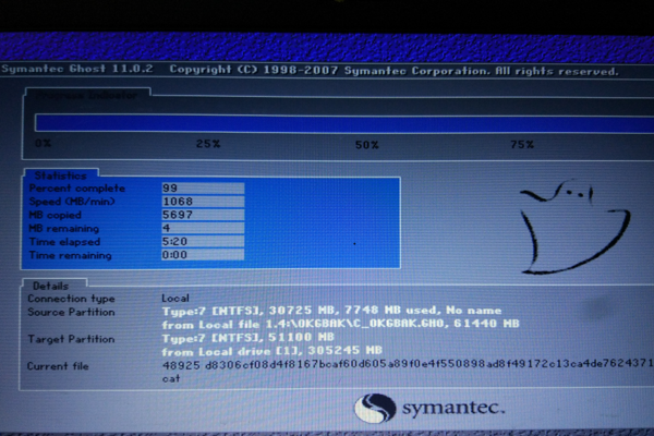 7、等待系统自动重启,并进入ghost还原过程,此过程全程自动,无需手工操作,等待该过程全部完成后,整个windows系统就完成了还原。