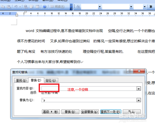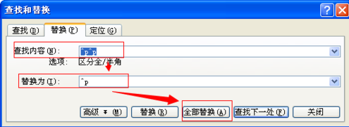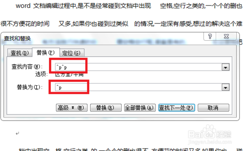 2、在【查找内容处】写上^p^p,在替换为写上^p,然后点【全部替换】即可(注:^就是数字6上面的键,要用shift+6哦,并且必须在英文格式下才能打出来)。