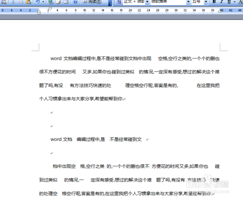 1、首先打开电脑上的Word软件,以演示文档为例,将文档人为弄出多个空行。