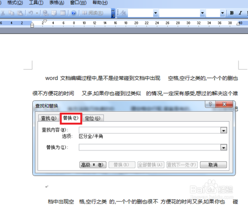 实现去多余空行,找到WORD文档菜单栏上的"编辑"--选择“替换”,弹出查找替换窗口,如果选项卡不是在替换,请点击替换.