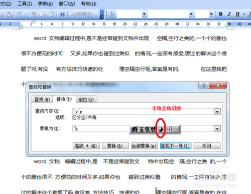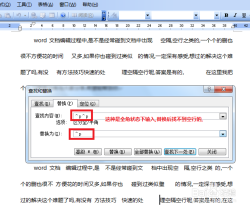 在弹出对话框的“查找内容”中输入^p^p,在“替换为”中输入^p,这里特别注意的是,全角与半角的区别,一般全角状态下是实现不了的,所以必须是英文或者半角状态下输入.还有"^"字符按shift+6就可以了.