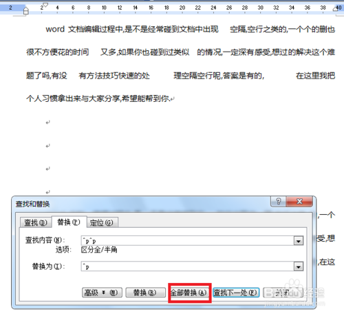 6、最后点击全部替换,这样就可以删除word中的空白行了。