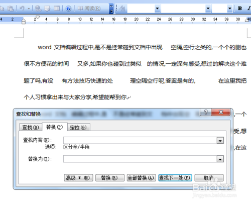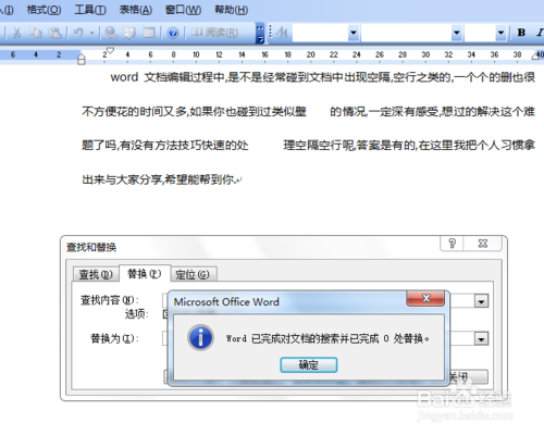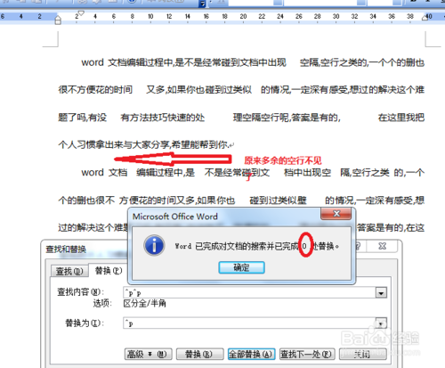 接下来点击"全部替换",如果没有感觉出已替换,不放心,可以再点击几次也是可以的.直到出现“word已完成对文档的搜索并已完成0处替换”,这样多余的空行就不见了