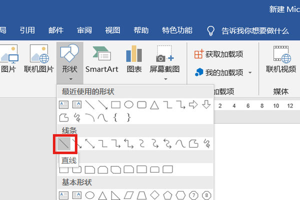 3.点击形状线条菜单里面的“直线”图标,如下图红框所示;