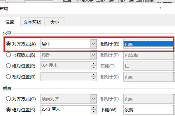 8.在位置菜单水平选项中,选择对齐方式改为“居中”相对于“页面”,如下图红框所示;