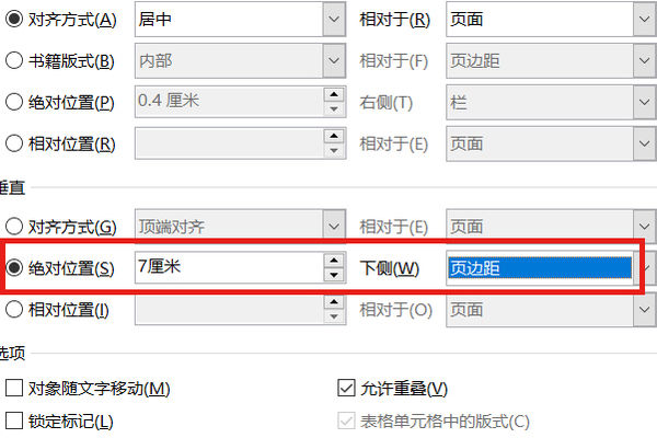 9.垂直选项中绝对位置为“7厘米”,下侧为“页边距”,如下图红框所示;