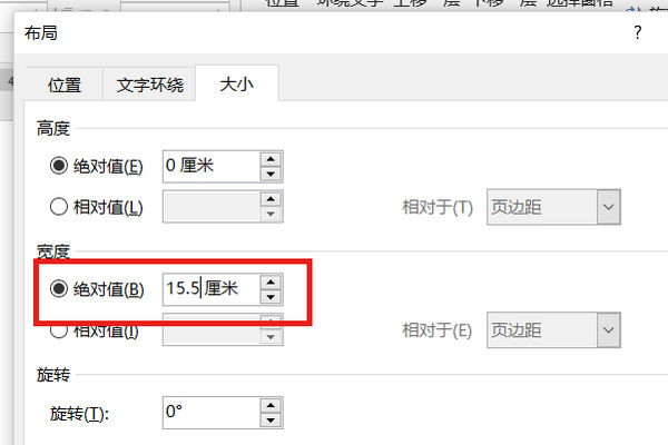 10.更改大小中的宽度绝对值为“15.5厘米”,如下图红框所示;