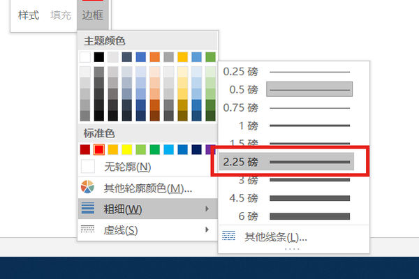 14.粗细改为“2.25磅”即可,如下图红框所示;