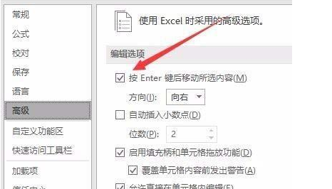 3、然后我们在弹出来的窗口中点击打钩“按Enter键后移动所选内容”。