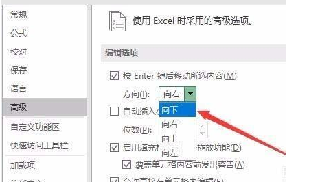 4、接着在方向下拉菜单中找到“向下”菜单项,把方向修改为向下,最后点击确定按钮保存退出。下面再编辑Excel文档的时候,按下回车键就是换行,而非向右移动一个表格了