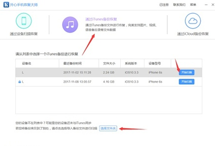 运行开心手机恢复大师,利用开心手机恢复大师的【通过iTunes备份恢复】模式。选择需要恢复的iTunes备份文件,点击【开始扫描】对设备数据进行扫描。
