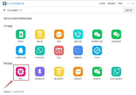 跳转数据恢复的主界面后,可以看到有通讯录、短信、照片等17种数据。点击图标恢复对应的数据。我们想要恢复照片,点击【照片】图标。