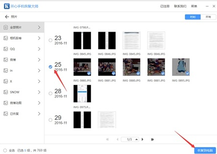 扫描完成进入照片的恢复界面后,就可以看到我们已经删除的各种照片了,勾选要恢复的照片,选择恢复到电脑即可。如图所示。