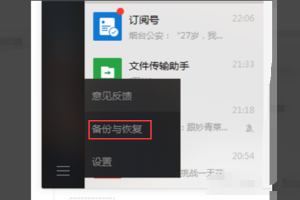2、然后在微信界面的左侧找到电脑微信中的备份与恢复选项,点击备份与恢复选项;