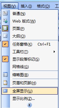 1、单击“视图”菜单下的“全屏显示”,系统会自动全屏显示Word文档