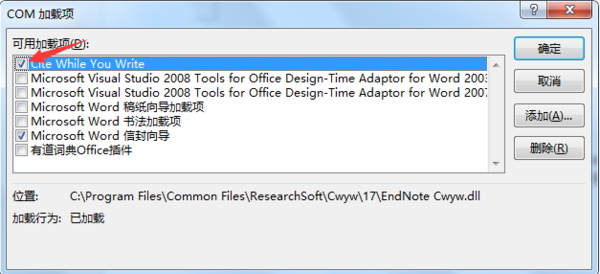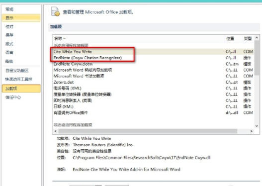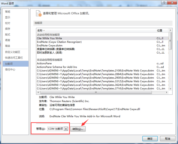 2、选择“COM加载项”,点击”转到“勾选”cite while you write“确定即可。