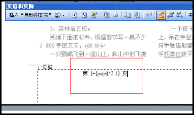 4、将光标移到内部一对花括号之后,输入“*2-1”,此时,在页脚处得到这样一行域代码:“{={page}*2-1}}”;