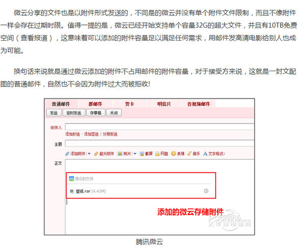 腾讯推出的腾讯微云云存储服务已经覆盖到QQ周边的功能,比如微云目前已经可以与QQ邮箱搭配使用,可以完美解决QQ邮箱中的大附件限制的问题。