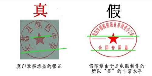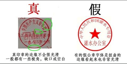 指的是盖章的角度,虽然绝大多数人盖章的时候都希望把章盖的很正,但是总会出现一点点偏差,特别是圆形的印章更不好把握。但是电脑制作印章时默认情况下肯定100%是正的,大家看一下上面真假印章的对比就知道了。虽然印章盖的正与不正并不能判断印章的真假,但是作为一条判别假印章的线索,请大家综合运用。