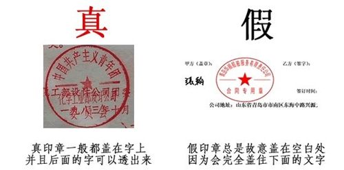 看看公章是盖在协议的空白处,还是盖在文字上。一般而言,真印章都盖在公司名称上,而制作粗劣的假印章都喜欢盖在空白处,因为假印章是电脑做的,如果盖在文字上就会挡住后面的文字。但是制作水平高一些的假印章为了看起来更真,也会盖在文字上,这个时候你需要仔细看一下,印章上的字和纸上印刷的字重合的地方,如果是真印章即使重合了,后面的文字还是可以透过油墨显示出来;而电脑制作的假印章,就会完全挡住下面的文字。