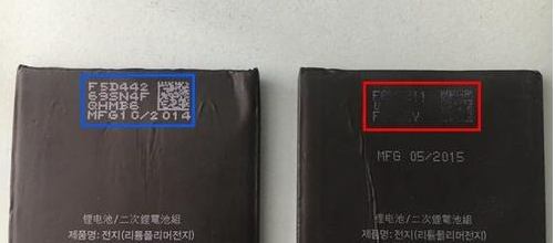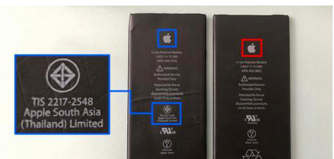 5、还有就是看电池的生产日期,举例:iPhone5S的电池,基本都是2013、14年左右生产的, 而2016年的基本都是仿制的电池或者组装电池。同理其他型号也可以选择这种鉴别方法去简单的初步判断,电池生产年限与机器上市相差1年上下时间,可以参照5S的这种判读去估算,相差时间过多就是非原装电池了,下图右面那块红色标记的为5S非原装电池。