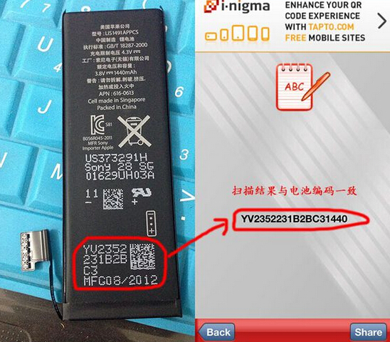 苹果手机内部电池上面的二维码是防伪用的,如果是正品则可以扫描出来,且和二维码旁边的防伪码一样,如果是假的,扫描不出或者不一样,如下图: