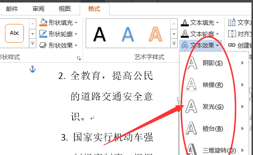 4.之后再‘格式’选项的下面右方找到‘文本效果’,点击文本效果后面的三角形,会出现很多种样式。