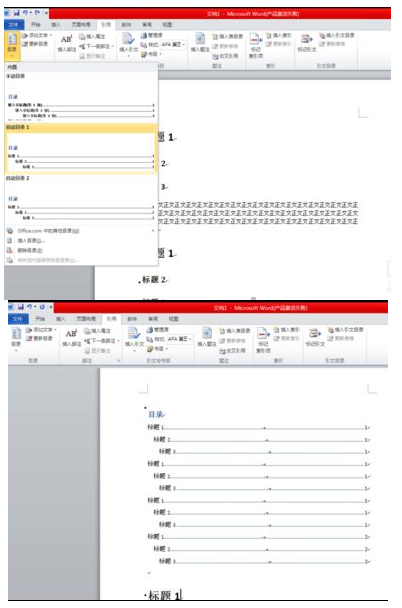 步骤六:将光标移动至要插入目录的位置,选择【引用】→【目录】→【自动目录1】,即可完成自动目录的插入。