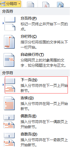 点击“分隔符”下方的小三角形,将出现如下的下拉目录,选择“分节符”中的“下一页”
