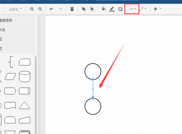 2、选择线型,鼠标点击一个图形的连接点后,连接线跟随鼠标点击另一个图形连接点连接;