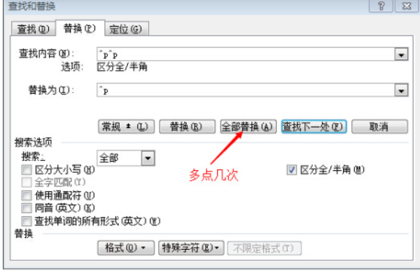 2、设好查找替换项后点“全部替换”。替换完成会提示你查找到几个,多点击几次,直到查找替换数为零。