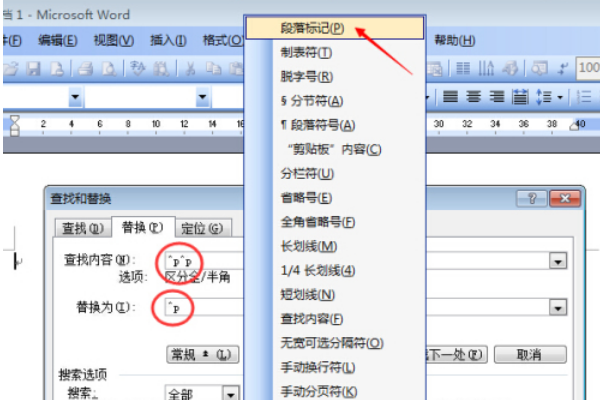 1、快捷键ctrl+h调出替换窗口,进入高级窗口,“查找内容”处通过点击“特殊字符”插入两个“段落标记”,“替换为”处插入一个“段落标记”。