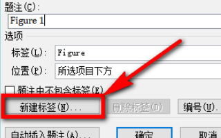 3、这会儿就会弹出题注窗口,在窗口中我们看到题注的名称为英文格式,我们需要对其改为中文,那么在图示窗口位置点击【新建标签】。