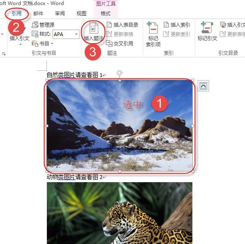 1、打开word后,如果没有插入图片的话先插入图片,插入图片以后点击选中该图片,然后点击word菜单中的【引用】。