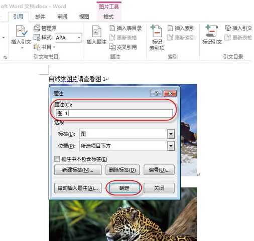 3、“题注”栏,自动填充为“图1”,点击“确定”。选中的图片已经自动添加序号。