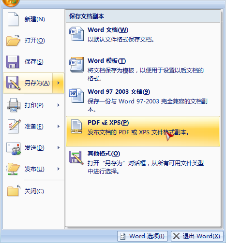 8现在再点击那个office按钮里的另存为,可以看到有个“PDF或XPS(P)”: