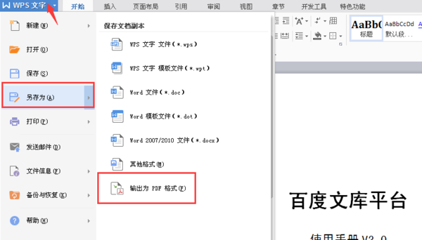 3、点击wps,然后将鼠标放在另存为上,选择输出为pdf格式