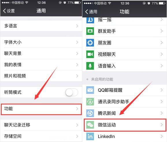 2.随后点击【功能】,接着下拉点击【微信运动】。(如下图)