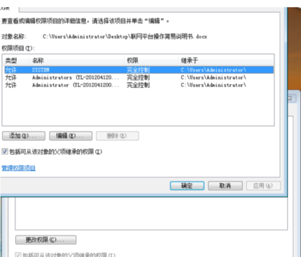 2、在资源管理器中鼠标点中该文件,右键→属性→安全→组合用户名→找到自己的身份→点最下面的高级按钮→权限选项卡→找到自己身份→查看自己的权限,若没有权限→点击添加→高级→查找→选中最高权限的administrator→确定。(若有了权限要勾选完全控制)